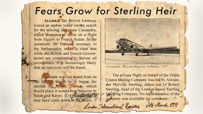 6 марта 1937 года в газете была опубликована статья, описывающая катастрофу и ход расследования. Согласно статье, последний раз о самолёте слышали 3 марта, когда он вылетел из Салаха, Алжир, и начал вторую часть своего полёта в направлении Французского Судана.