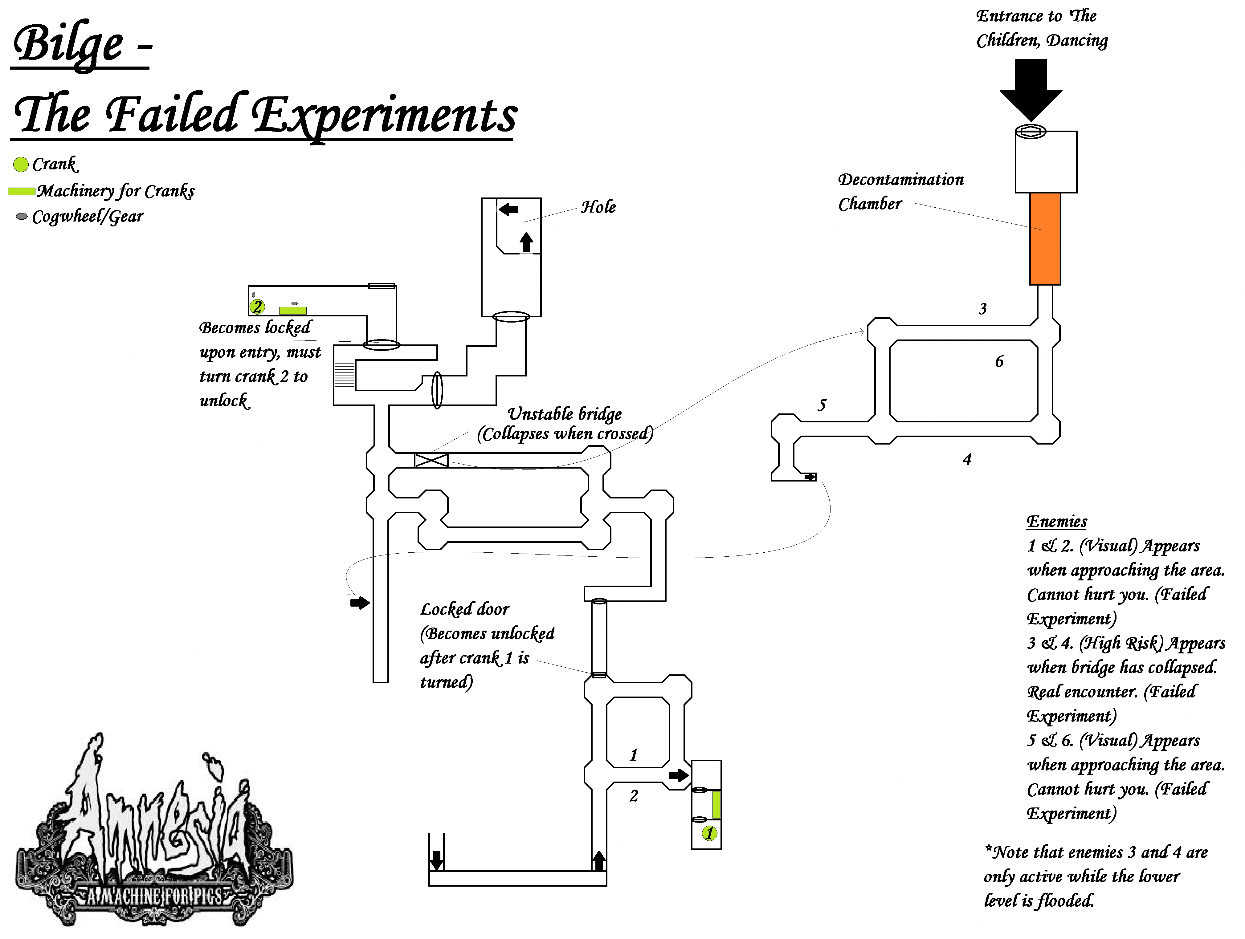 - This pump will drain the waters bellow you so that you can travel this level more safely. Now exit the room and go down to the bottom level via the previous ladder you used and enter the Decontamination Chamber and to the “The Children, Dancing”