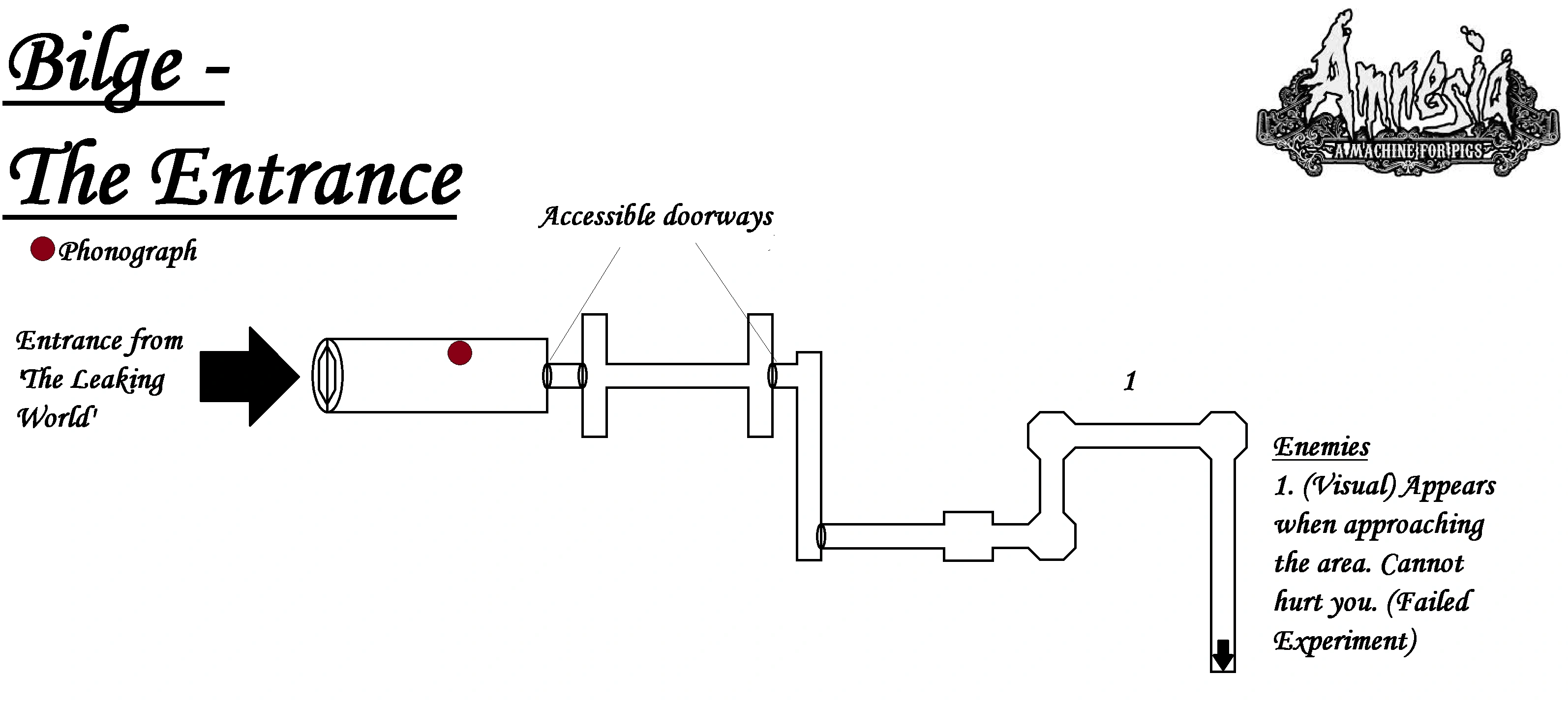 The Bilge or Bilge Pumps is the ninth (9th) area of Amnesia: A Machine for Pigs. It features a vast system of water containers, pipes, pumps and various machinery intercrossed with numerous catwalks. The purpose of this area is similar to the Cistern found in the previous game, as it is used to store water, though primarily rotten water.