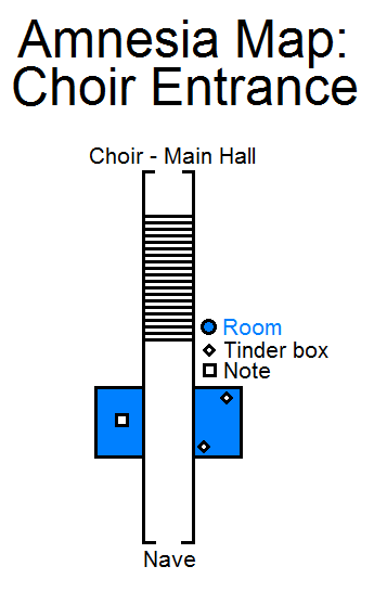 The Choir Entrance is a short hall consisting of a staircase and one room on either side. In the room to the right a torture device and some supplies can be found. The room on the left contains a journal entry that will trigger an interactive flashback where Daniel brutally kills a prisoner by tracing lines painted on his chest with a curved dagger. At low sanity, bodies will appear to hang from the ceiling in the corridor.