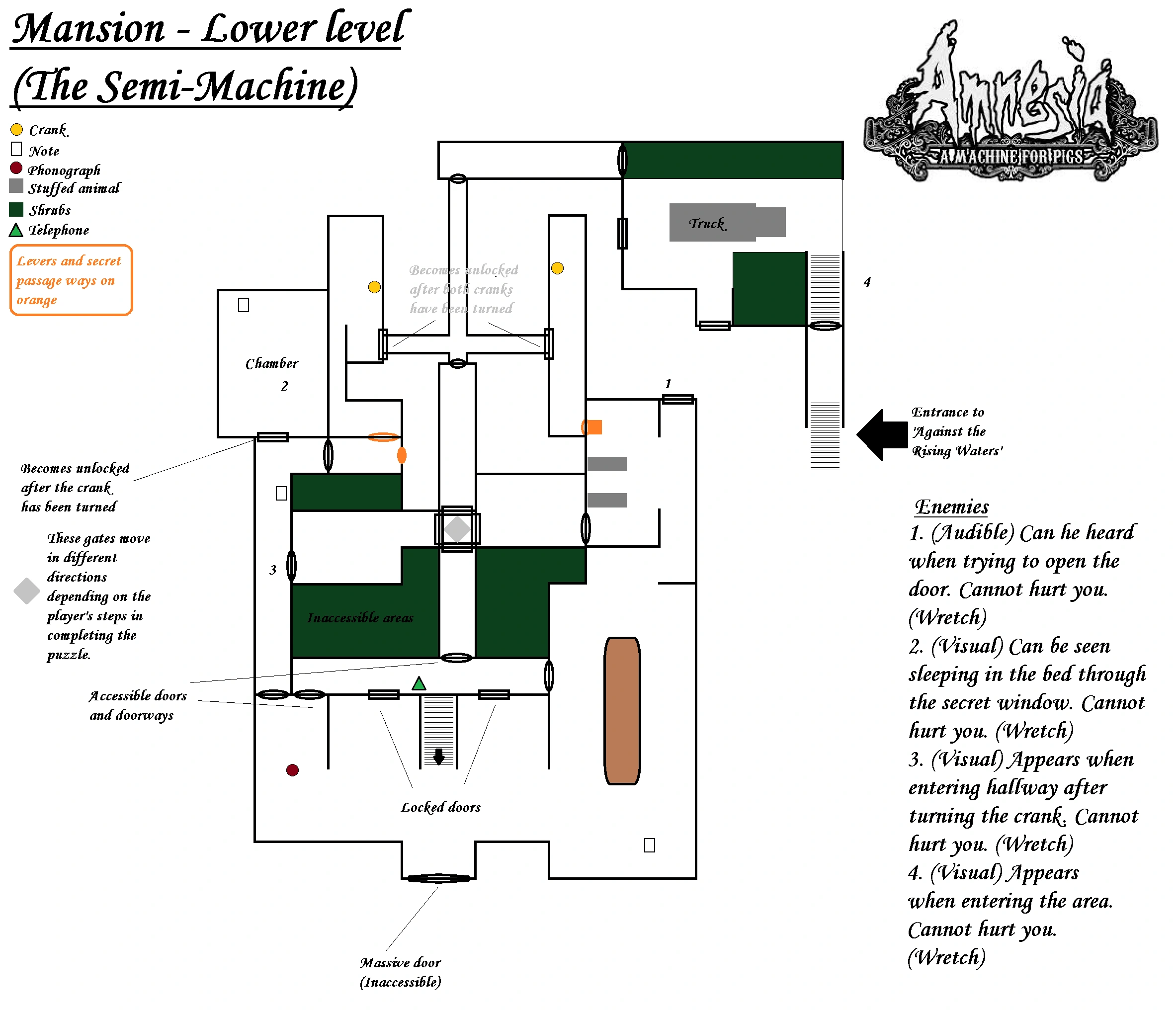 This part of the mansion is semi-integrated into the facility which is evidenced by numerous hidden sections leading to a number of machine rooms and also by the strong tremors caused by the Machine below. The machinery is hidden behind objects such as the Grizzly Bear at the trophy room, and the bathtub in the guest bathroom. The bear can be moved aside to open the hidden room, while the hidden room behind the bathtub can be opened by using a lever hidden behind a painting.