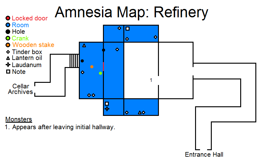 The Refinery is a room in Brennenburg Castle that can be accessed from the Entrance Hall. It was featured in the Demo, as the second of the three areas included. It is the seventh area explored in the game and the last accessible from the Entrance Hall.