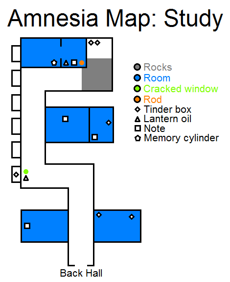 The flow cycle control rod for the Machine Room is kept in the study. Unfortunately, a cave-in has blocked the room with the rod, so Daniel must break the weakened window on the far left and hop along the edge of the building to get there. The Shadow, aware of him, will immediately overtake the nearby forest and consume the area, felling pine trees and frightening Daniel. In this remote section of the Study, one of Alexander's memory capsules can be found. On low sanity in this room, three sides of meat can be seen hanging in the dark corner over the fallen bookshelf.