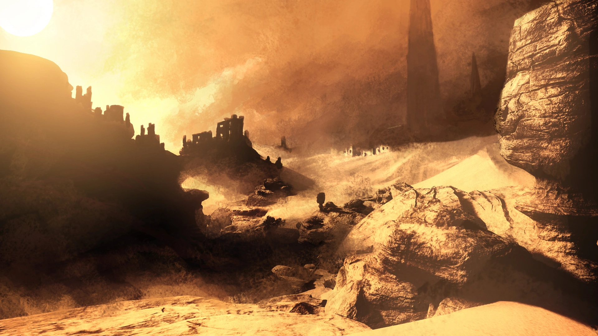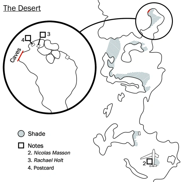 This is the first area for gameplay purposes. The interior of the Cassandra is desolate, and the whole area nearby is deserted. Tasi awakens on the floor of the plane, a few days after crash, alone and confused. You can hear Dr. Metzier's voice coming through the radio, but you are not able to make it work on your side. In order to exit the Cassandra, you must pick up the handle on the ground near the door, and use it on the door. Flashbacks begin almost immediately upon exiting the plane. The heat of the sun quickly begins to bake Tasi, and she must stick to the shade to avoid the unpleasant sensation of direct sunlight. An auditory cue will inform you when Tasi begins to get overheated, but nothing will happen if you continue to stay in the direct sunlight save for the audio cue.