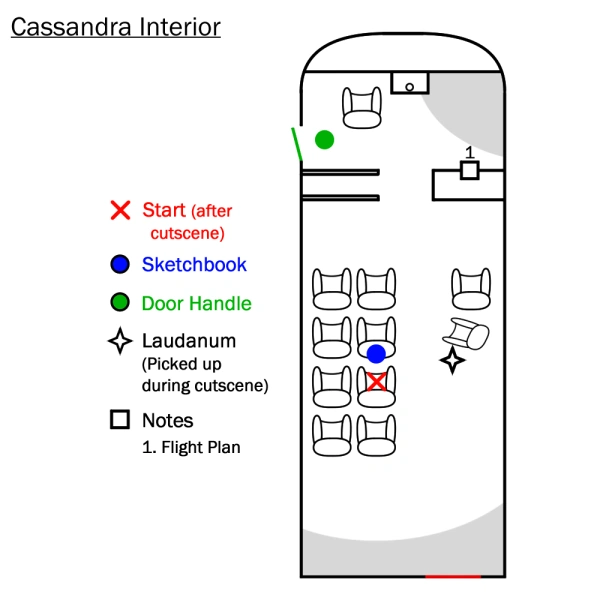 The Cassandra's layout remains the same as it is shown during The Flight, as the cabin seems to have mostly survived the crash.